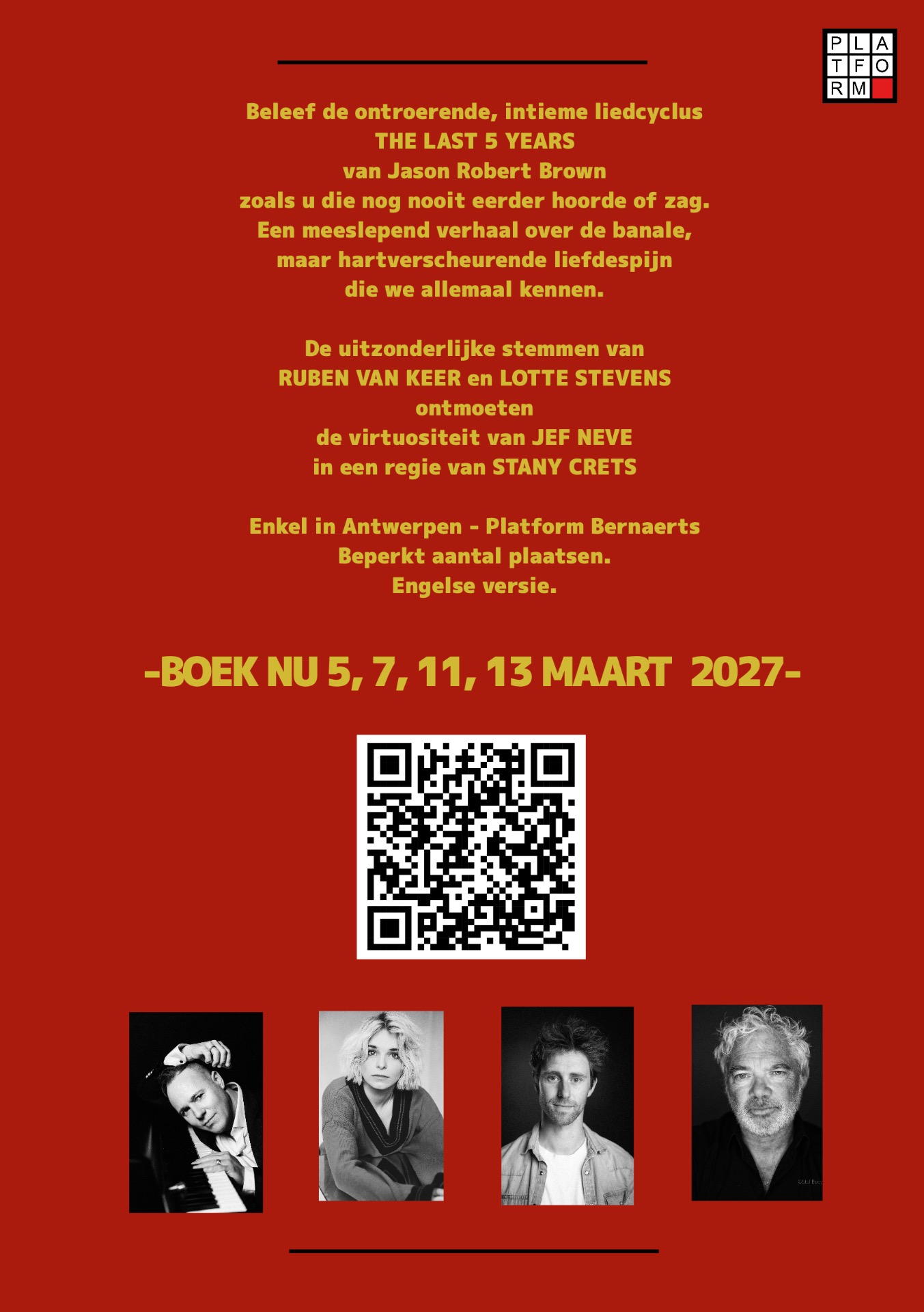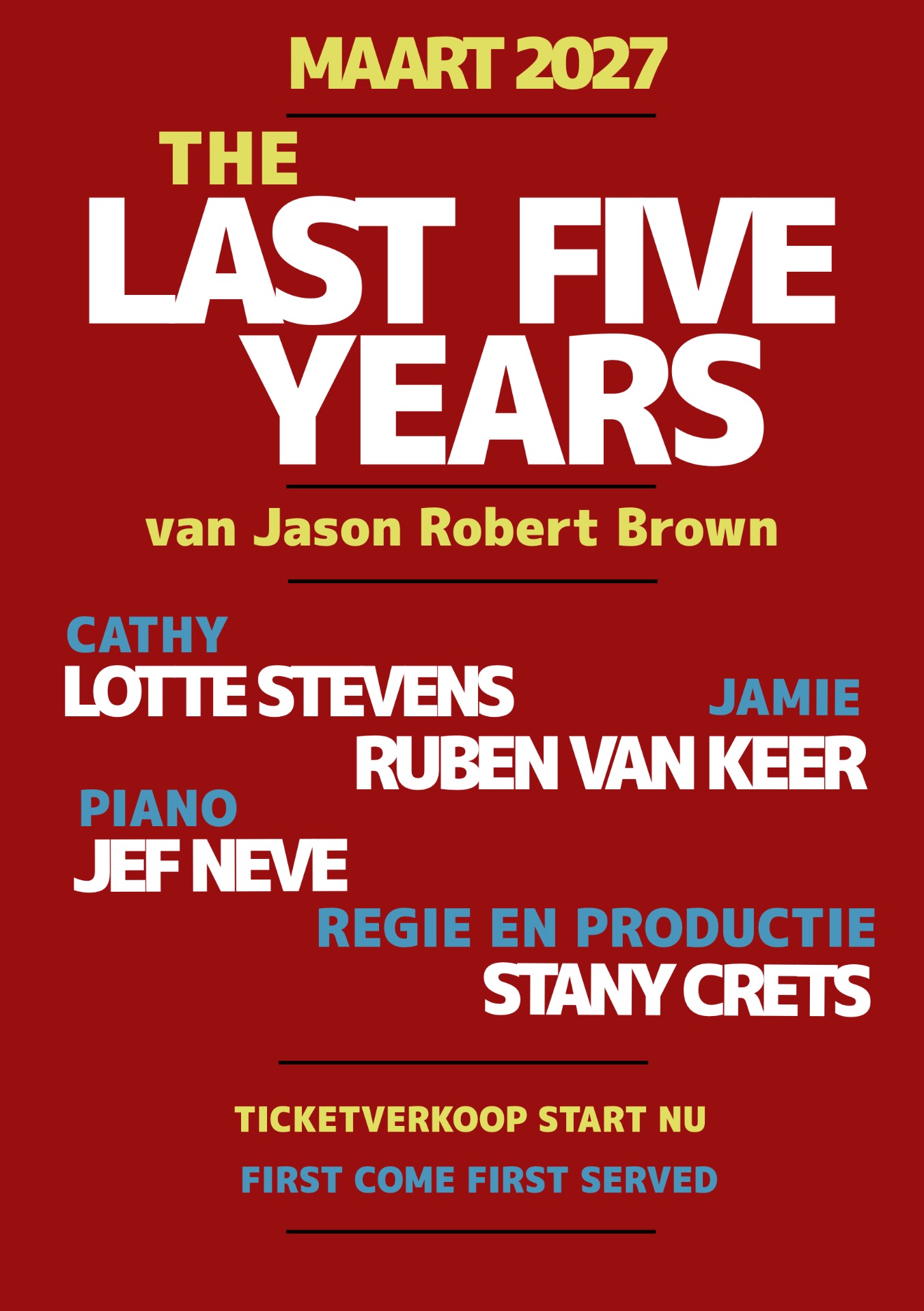 The Last Five Years is een intieme musical van componist en schrijver Jason Robert Brown, die in 2001 in première ging in Chicago. Het stuk vertelt het verhaal van een relatie tussen Cathy en Jamie, elk vanuit hun eigen tijdslijn: zij blikt terug op het einde, terwijl hij vooruitgaat vanaf het begin.